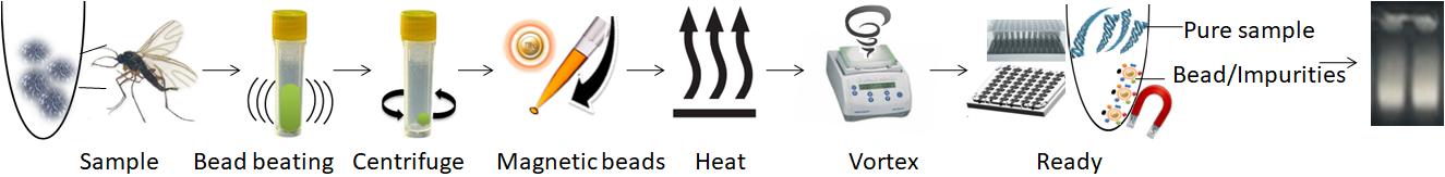 BcMag? 一步法昆蟲DNA純化試劑盒可以從新鮮,冷凍或儲(chǔ)存的昆蟲標(biāo)本(如蚊子,蜜蜂,虱子,蜱和黑腹果蠅)中快速,無需離心柱,提取高質(zhì)量基因組DNA。該試劑盒使用我們獨(dú)特的專有磁珠和緩沖液,有效裂解細(xì)胞,同時(shí)去除水性緩沖液中的PCR抑制劑類雜質(zhì),使DNA不受影響。該提取過程采用溫和的裂解條件,避免了嚴(yán)苛裂解條件對(duì)核酸的破壞,如堿性裂解和有毒化學(xué)物質(zhì)裂解細(xì)胞;保證了DNA的完整性和避免了殘留在樣品中有機(jī)溶劑耗時(shí)的清除過程。此外,本試劑盒中磁珠還可以一步從樣品中清除PCR抑制劑(圖1),而無需DNA提取過程。