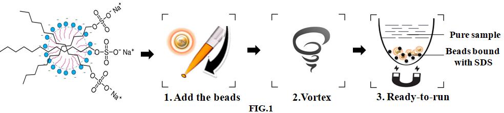 本款磁珠可以快速有效地從樣品中去除游離SDS。過程非常簡單(圖1)。1.直接將磁珠添加到樣品中。2.用移液器吹吸或渦旋方式捕捉游離SDS洗滌劑。3.將磁珠從蛋白質(zhì)或DNA/RNA溶液中分離,純凈的蛋白質(zhì)或DNA/RNA留在溶液中。與標(biāo)準(zhǔn)滴液柱法和分批法相比,易于使用的磁珠顯著改善了純化結(jié)果,使蛋白質(zhì)損失降低到最小(<10%)。由于使用的磁珠體積很小,因此,樣品的最終蛋白質(zhì)濃度不會(huì)有顯著降低。