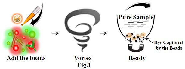 使用程序非常簡單(圖1)。1.直接將磁珠添加到樣品中。2.用移液器吹吸或渦旋方式捕捉游離染料。3.磁珠從蛋白質(zhì)或DNA/RNA溶液中分離出來,而上清液中含有純化后的生物樣品。
