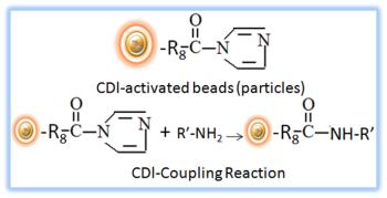 CDI活化磁珠是固定含有胺基的親和配體的另一種替代方法。當(dāng)載體在水性結(jié)合緩沖液中與含伯胺的配體反應(yīng)時(shí),咪唑基團(tuán)丟失,并形成氨基甲酸酯鍵。結(jié)合反應(yīng)可在堿性pH(8.5-10)條件下發(fā)生;但是,它與還原胺和蛋白質(zhì)的偶聯(lián)化反應(yīng)相比,結(jié)合速度較慢。該反應(yīng)也可以在含有有機(jī)溶劑緩沖液中進(jìn)行,以配合水不溶性配體的偶聯(lián)。CDI活化磁珠可以很好地固定多肽和微小化合物。