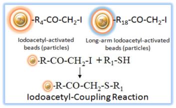 BcMag ? 碘代乙?;罨胖槭蔷鶆虻?/span>,二氧化硅基質(zhì)的超順磁珠,表面連接有高密度的碘代乙酰基官能團(tuán)。它可以通過與巰基(-SH)反應(yīng)快速,高效的共價固定蛋白質(zhì),多肽和其他配體,用于親和純化實驗。在堿性生理環(huán)境(pH 7.2--9)下,在含有20-30%DMSO或DMF的水性或有機(jī)溶劑中,碘代乙酰基活化的載體與巰基反應(yīng),產(chǎn)生穩(wěn)定的硫醚鍵。這些反應(yīng)通常在黑暗環(huán)境下進(jìn)行,以防止游離碘的形成,因為游離碘可與酪氨酸,組氨酸和色氨酸殘基反應(yīng)(圖1)。親水表面可確保磁珠的非特異性吸附低,分散性好,便于在各種緩沖液中操作。BcMag ? 碘代乙酰基活化磁珠最適合結(jié)合較大的蛋白質(zhì)。BcMagTM長臂碘代乙酰基活化磁珠被推薦用于結(jié)合小分子多肽,因為它的長臂(20個原子)親水接頭可以減少空間位阻。