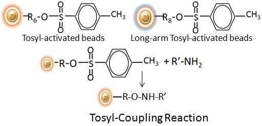 BcMagTM甲苯磺?;罨胖?/b>是表面覆蓋有高密度甲苯磺酰基官能團的二氧化硅基質(zhì)的磁珠。短臂和長臂的甲苯磺?;罨胖榭梢栽诓灰肴魏坞姾傻那闆r下,在水或有機溶劑(30%DMF)中有效地共價結合含有伯胺基的配體(圖1)。BcMag? Tosyl-Activated Magnetic Beads最適于結合大分子蛋白。長臂甲苯磺酰基磁珠則被推薦用于結合小分子物質(zhì),因為它可以減少位阻現(xiàn)象。