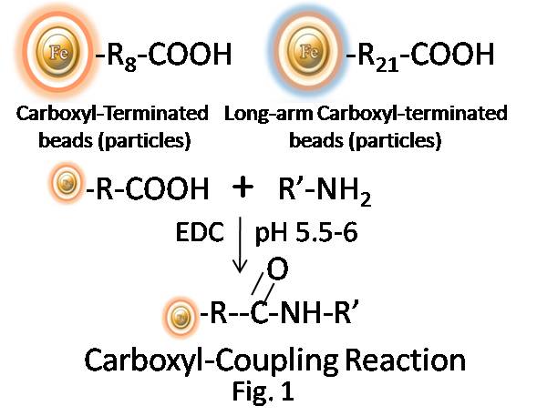 BcMag ? 羧基磁珠是二氧化硅基磁珠,表面連接有一層致密的羧酸基團(tuán),確保均勻性。這些高密度羧基基團(tuán)能和含有伯胺基的配體,穩(wěn)定地形成酰胺鍵從而共價(jià)結(jié)合(如圖1所示)。它的親水表面確保磁珠優(yōu)異的分散性,低概率的非特異性吸附,并且易于在各種緩沖液中處理,使其成為結(jié)合較大蛋白質(zhì)的理想選擇。對于結(jié)合小分子肽,建議使用BcMag?長臂羧基磁珠,因?yàn)樗鼈兙哂械拈L臂親水性接頭,可以減少空間位阻。