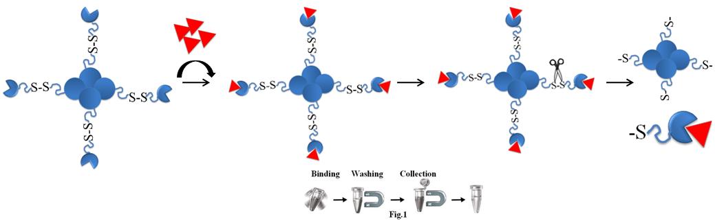 BcMag? Cleavable Streptavidin Magnetic Beads是表面覆蓋有高純度(>97%)鏈酶親和素的二氧化硅基質(zhì)的超順磁性磁珠。由于鏈酶親和素通過內(nèi)置的可切割二硫鍵連接物(圖1)與磁珠連接,因此,可用還原劑(如DTT或β-巰基乙醇)從磁珠上切割并分離出鏈酶親和素-生物素化分子的復(fù)合物,而不需要像親和純化一樣,在純化后使用苛刻的洗脫試劑(如8M胍或SDS洗滌劑)洗脫目標(biāo)產(chǎn)物(圖1)。這款磁珠經(jīng)過專門設(shè)計(jì)和測試,可用于免疫沉淀、細(xì)胞分選以及從細(xì)胞裂解物或雜交反應(yīng)中快速捕獲目標(biāo)分子,如DNA、RNA、抗體或蛋白質(zhì)等。