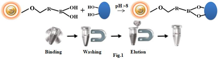 親和純化法是分離生物化合物的常用方法。其中,硼酸鹽親和層析是一種非常獨特的純化技術(shù),因為在基質(zhì)上連接的配體(間氨基苯基硼酸),在pH 8-9下可以特異性和可逆性地結(jié)合,含有順式二醇鄰二醇化合物的物質(zhì),并在pH 3-4條件下,在含有山梨醇的緩沖液中將其分離出去(圖1)。硼酸鹽親和樹脂可以從復(fù)雜生物樣品(如人血清)中有效富集含順二醇化合物(如醇類、核苷、核苷酸、核酸、碳水化合物、糖蛋白和酶)的有效實驗工具。盡管目前有大量的基于硼酸鹽親和性質(zhì)的不同材質(zhì)產(chǎn)品(如純化柱)可用,但這些產(chǎn)品存在操作程序繁瑣、耗時,并且無法處理非常微小體積的樣品(如癌細(xì)胞靶向和單細(xì)胞分析)等缺點。我們開發(fā)了一種全新的、有效的磁力親和系統(tǒng)來克服這些限制。