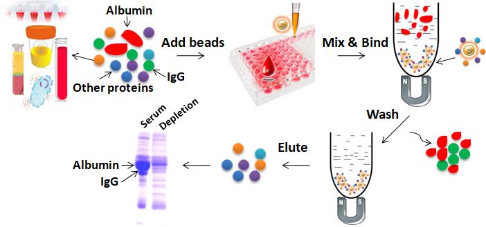 雖然親合染料配體Cibacron Blue F3GA可以共價結合到商用載體上,用于從水溶液和人血漿中吸附HSA,但它的選擇性結合能力較差。在免疫親和系統(tǒng)中,也使用抗白蛋白抗體對HSA進行結合。蛋白A通常用于去除IgG。這些技術通常具有較好的特異性,但成本高昂。此外,由于這些方法中有許多是基于瓊脂糖樹脂或其衍生結合柱進行實驗,因此,它們富集含量較低的蛋白質的過程非常耗時,無法在短時間內處理大量樣品,并且難以適應自動化系統(tǒng)。同時,根據(jù)實驗要求,有時需要增加樣品體積來進行實驗研究,這就需要額外的蛋白質濃縮步驟。這就需要具有提高效率、均勻性和吞吐量的,新白蛋白去除方法來解決上述問題。