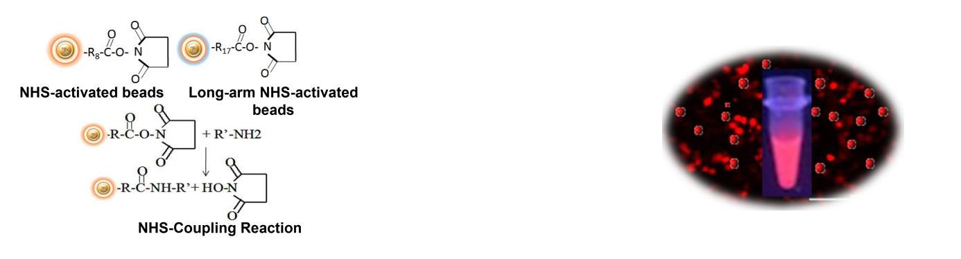 BcMag ?NHS活化銪熒光磁珠是在表面連接高密度NHS(N-羥基琥珀酰亞胺)官能團(tuán)的時(shí)間分辨熒光(TRF)磁性微球。磁珠利用可靠的NHS酯進(jìn)行化學(xué)固定,不需要使用危險(xiǎn)化學(xué)品。而且本磁珠具有較低的非特異性結(jié)合率,并且不會(huì)造成偶聯(lián)配體的泄漏。通過形成穩(wěn)定的酰胺鍵(圖1),偶聯(lián)效率超過85%,該磁珠可以快速,有效地共價(jià)結(jié)合任何含伯胺的配體。Bioclone NHS活化磁珠反應(yīng)僅需不到一個(gè)小時(shí)(在室溫pH 7-9下為15-30分鐘,在4°C下為4小時(shí)),就可以產(chǎn)生非常穩(wěn)定的連接。