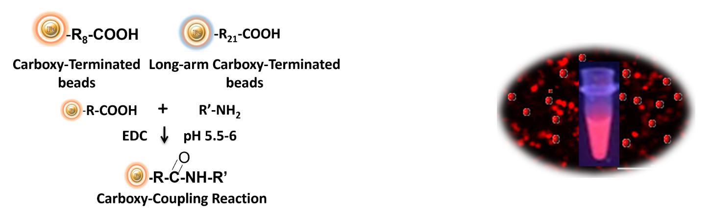 BcMag?羧基銪熒光磁性微珠(圖1)是一種表面連接有高密度羧基功能團的時分辨熒光磁性微球。EDC和其他碳二亞胺是零長度交聯(lián)劑,可使羧酸鹽(-COOH)直接與伯胺(-NH2)結(jié)合,而不會成為目標(biāo)分子之間最終交聯(lián)(酰胺鍵)的一部分。這些磁珠結(jié)合了預(yù)活化的羧基活性基團、時間分辨熒光染料和磁力特性的優(yōu)勢,可以進行非常敏感的分析。磁珠的制造采用了納米級超順磁性氧化鐵和銪金屬作為核心,并完全封裝在高純度二氧化硅外殼中,確保不會出現(xiàn)氧化鐵和銪金屬的溶出問題。
