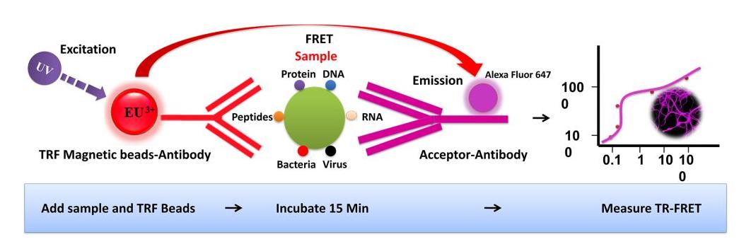 BcMag? TR-FRET測定方法與傳統(tǒng)的FRET(F?rster共振能量轉(zhuǎn)移)測定方法不同,它利用時間分辨熒光磁珠(BcMag? TR-Magnetic Beads)作為熒光供體團。供體和受體可以是兩個蛋白質(zhì)、兩個DNA鏈、抗原、抗體或配體或其它受體。在一定的時間延遲后(通常為50至100秒),當供體和受體分子靠近并以時間分辨方式進行監(jiān)測時,通過熒光共振能量轉(zhuǎn)移產(chǎn)生信號。在BcMag? TR-FRET測定方法中,微量的分析物可以通過時間分辨磁珠輕松地從樣品中富集,從而提高靈敏度。該測定方法消除了由樣品和塑料微孔板引起的所有熒光背景影響,以及直接激發(fā)受體所產(chǎn)生的背景影響。因此,BcMag? TR-FRET測定方法的信噪比非常高,背景值非常低。此外,該測定方法不需要清洗步驟。BcMag? TR-FRET測定方法在高通量篩選的生物分析中具有顯著的優(yōu)勢,如測定靈活性、可靠性、提高測定靈敏度、更高的通量和更少的假陽性/假陰性結(jié)果。