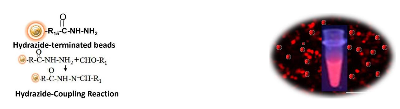 BcMag ? 酰肼基銪熒光磁珠是在表面連接高密度酰肼官能團(tuán)的時間分辨熒光(TRF)磁性微球。酰肼反應(yīng)可有效的通過糖基化位點(diǎn)標(biāo)記,固定或結(jié)合糖蛋白,糖基化位點(diǎn)通常(與大多數(shù)多克隆抗體一樣)位于遠(yuǎn)離需要保留其功能的關(guān)鍵結(jié)合位點(diǎn)的結(jié)構(gòu)域中。以這種選擇性地與靶向分子Fc部分的重鏈結(jié)合的方式偶聯(lián)抗體,有助于Fv區(qū)域末端盡可能最好地保存抗原結(jié)合活性。在pH 5至7條件下,酰肼基的載體和化合物將與氧化碳水化合物的羰基結(jié)合,從而產(chǎn)生腙鍵。